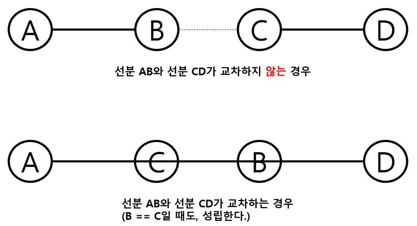 2차원 좌표 평면 위의 두 선분 L1, L2가 주어졌을 때, 두 선분이 교차하는지 아닌지 구해보자. 한 선분의 끝 점이 다른 선분이나 끝 점 위에 있으면 교차하는 경우이다.
