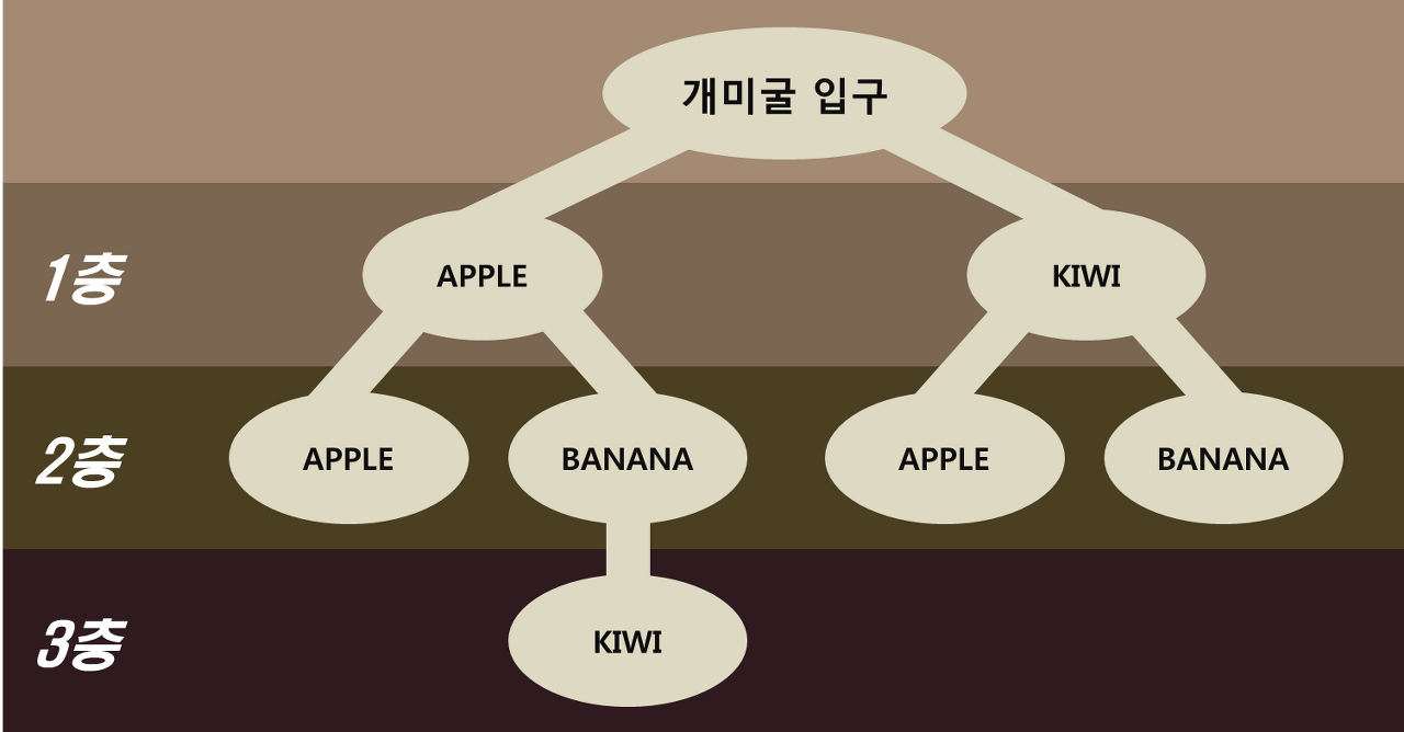 윤수는 로봇 개미들이 보내준 정보를 바탕으로 다음과 같이 개미굴의 구조를 손으로 그려봤다.
