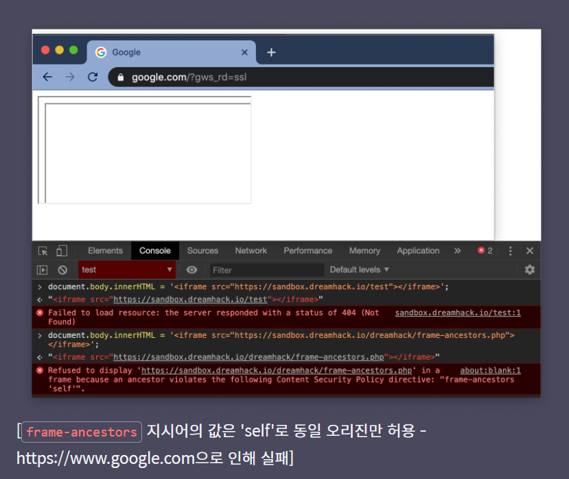 EX) Content-Security-Policy: frame-ancestors http://dreamhack.io *.google.com https://