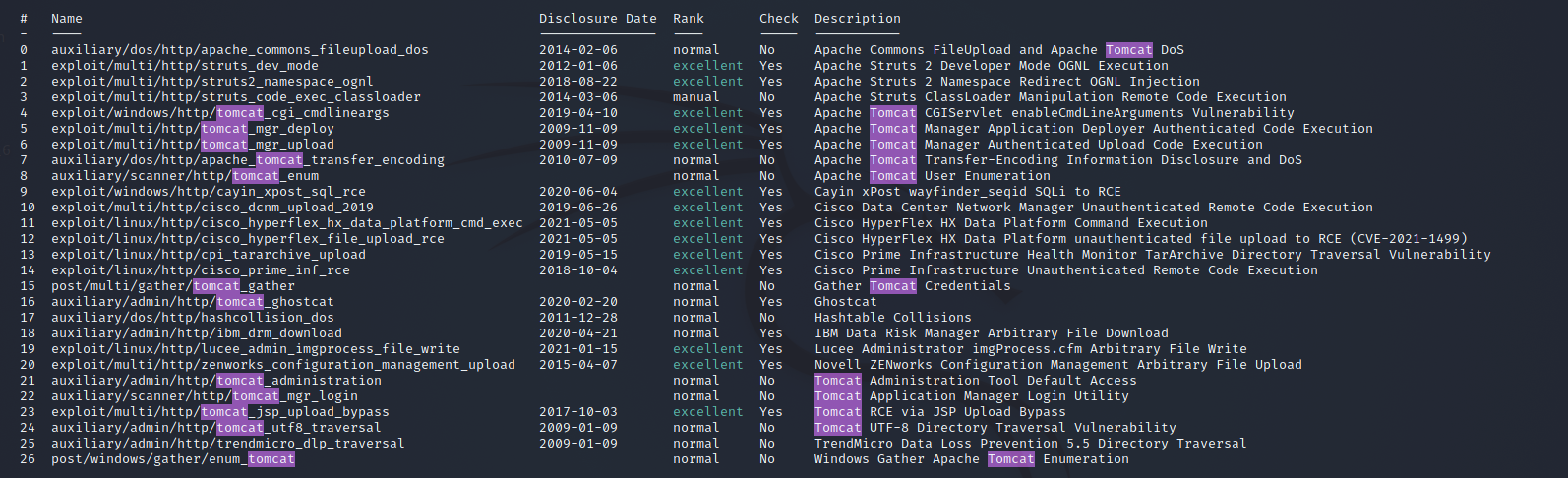 - search [탐색 대상] ex) tomcat에 대한 exploit을 해보고 싶으면 search tomcat