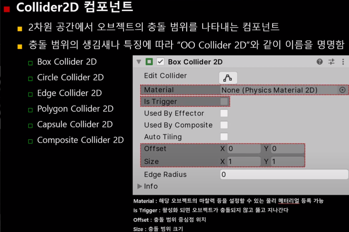 Edge Collider 2D는 점의 개수를 정하고 점의 위치를 바꾸어서 다양한 곡선이나 형태로 표현 가능