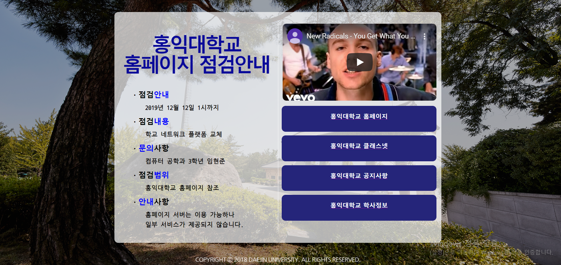 <div class="lframe"> <p class="category">· 점검<span class="point">안내</span></p> <p class="text">2019년 12월 12일 1시까지</p> <p class="category">· 점검<span class="point">내용</span></p> <p class="text">학교 네트워크 플랫폼 교체</p> <p class="category">· <span class="point">문의</span>사항</p> <p class="text">컴퓨터 공학과 3학년 임현준</p> <p class="category">· 점검<span class="point">범위</span></p> <p class="text">홍익대학교 홈페이지 참조</p> <p class="category">· <span class="point">안내</span>사항</p> <p class="text">홈페이지 서버는 이용 가능하나 </p> <p class="text">일부 서비스가 제공되지 않습니다.</p>