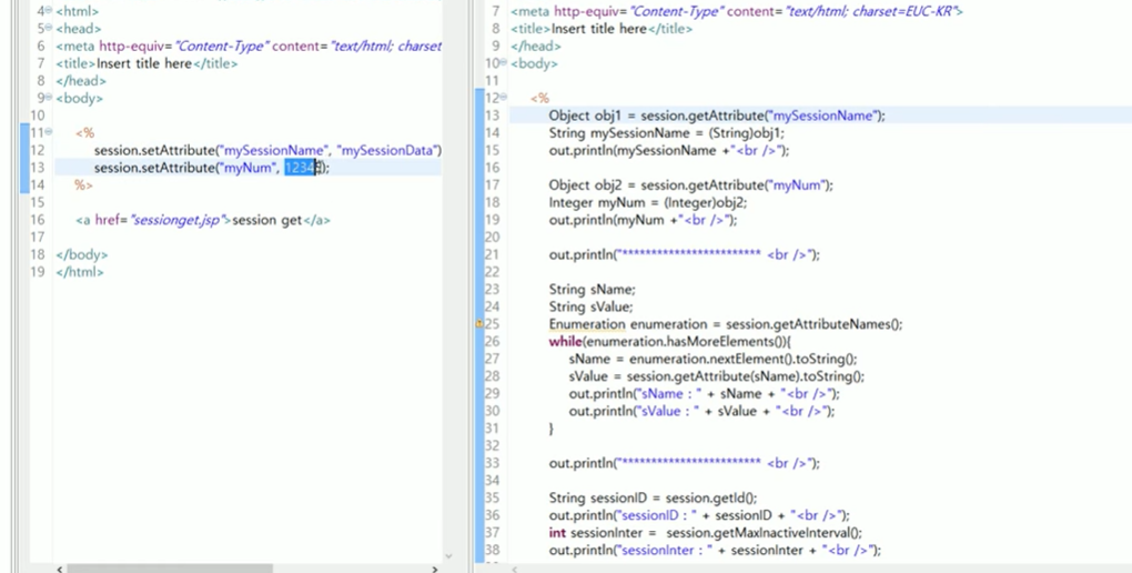 세션 - setAttribute(name, value) getAttribute(name) getId() removeAttribute(name)=> 클라이언트에 의해 생성된 세션들의 유니크한 아이디