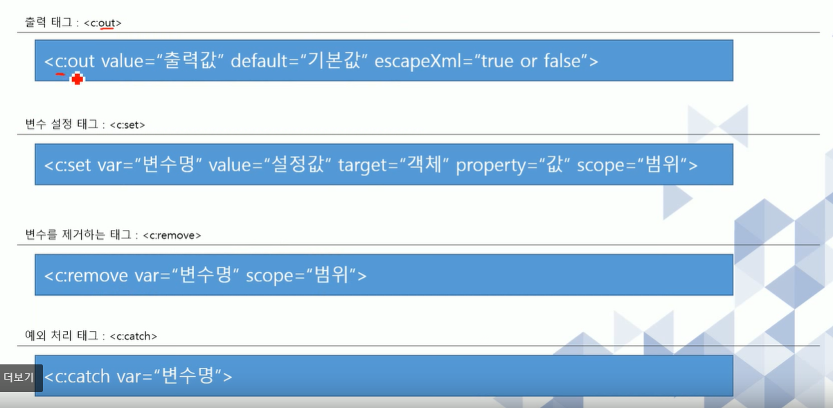 JSP 경우 HTML 태그와 같이 사용되어 전체적인 코드 가독성 떨어짐.