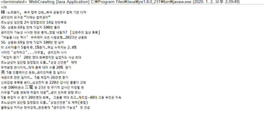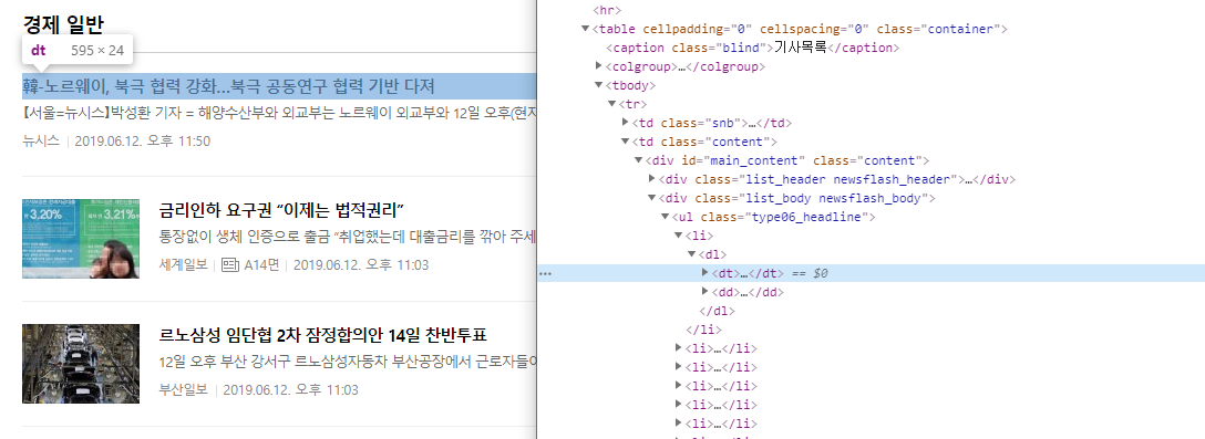 - elem 중에서 각 기사의 헤드는 dt영역에 저장되어 있으므로 for문을 통해 dt만 출력하도록 하는데