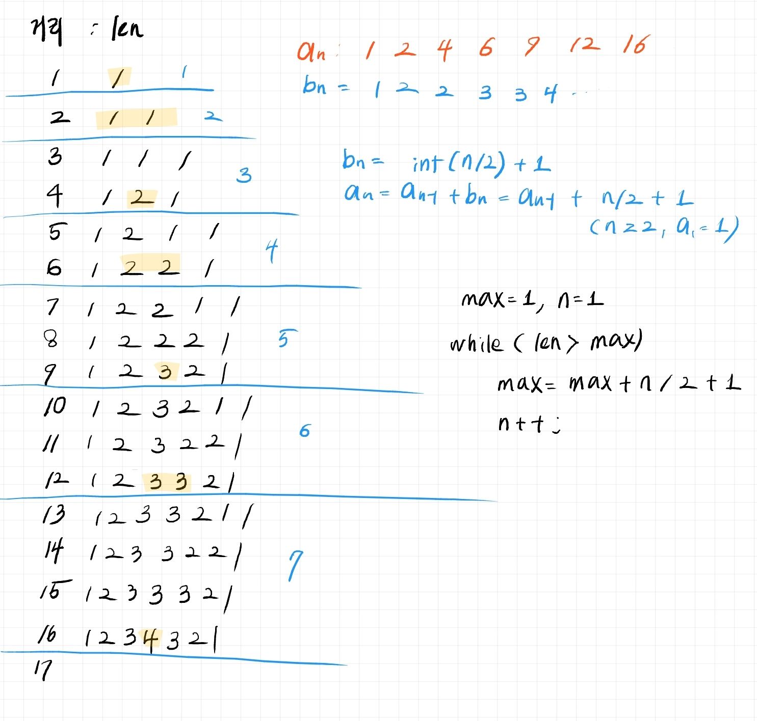 에서 부터 len(len - 1 ) + 1 <= x <= len(len + 1) 은 각 길이 별로 개수가 짝지어진 범위이다.