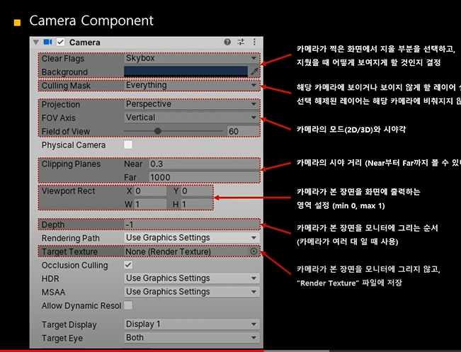 Scene에서 Main Camera 클릭 시 Inspector 확인