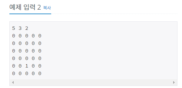 첫 줄에는 상자의 크기를 나타내는 두 정수 M,N과 쌓아올려지는 상자의 수를 나타내는 H가 주어진다. M은 상자의 가로 칸의 수, N은 상자의 세로 칸의 수를 나타낸다. 단, 2 ≤ M ≤ 100, 2 ≤ N ≤ 100, 1 ≤ H ≤ 100 이다. 둘째 줄부터는 가장 밑의 상자부터 가장 위의 상자까지에 저장된 토마토들의 정보가 주어진다. 즉, 둘째 줄부터 N개의 줄에는 하나의 상자에 담긴 토마토의 정보가 주어진다. 각 줄에는 상자 가로줄에 들어있는 토마토들의 상태가 M개의 정수로 주어진다. 정수 1은 익은 토마토, 정수 0 은 익지 않은 토마토, 정수 -1은 토마토가 들어있지 않은 칸을 나타낸다. 이러한 N개의 줄이 H번 반복하여 주어진다.