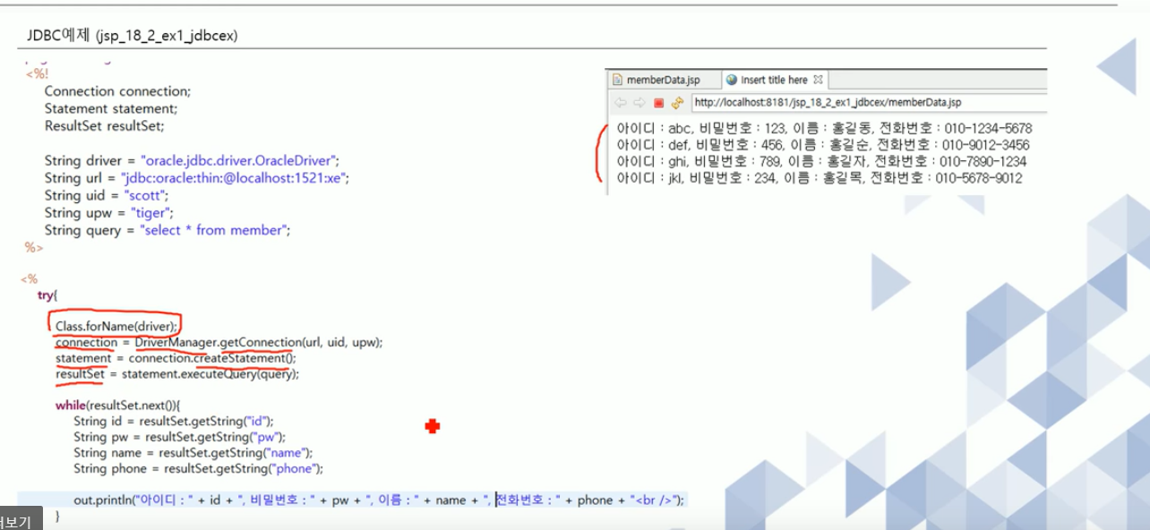 resultset의 get(칼럼, 값) 으로 데이터 빼옴.