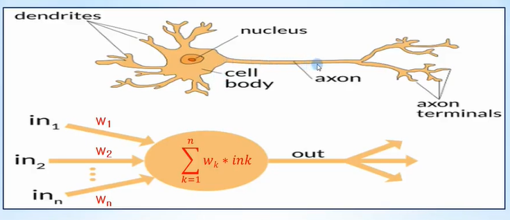 뉴런의 이전 뉴런의 출력을 각각 인풋으로 받아 모두 더함. 이 값이 threshold를 넘으면 다음 뉴런으로 전달