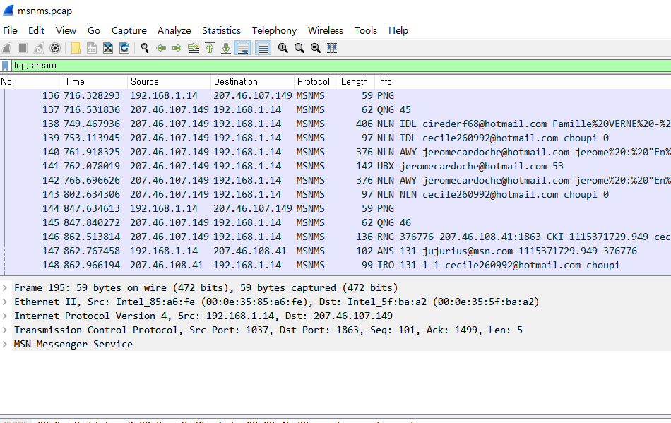 이메일 정보를 비롯한 다양한 정보 담긴 패킷 캡처되어 있음.